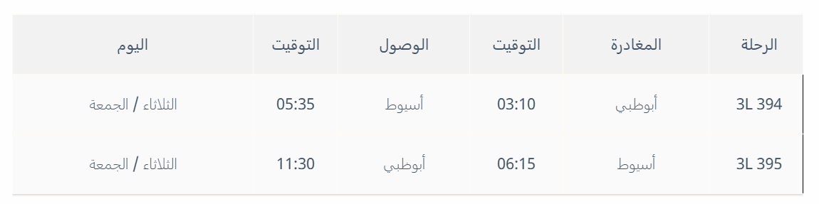 - رحلة رقم 3L 394: تغادر من أبوظبي في الساعة 03:10 صباحا، لتصل إلى أسيوط في الساعة 05:35 صباحا.
