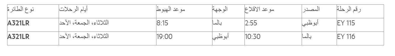 أما رحلة العودة رقم EY116، فتنطلق من بالما عند الساعة 10:30 لتصل إلى أبوظبي عند الساعة 19:00 في اليوم نفسه.