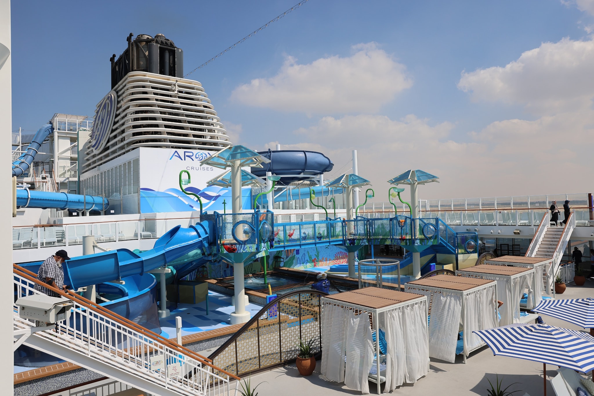 وترفع السفينة "AROYA" علم جزر المارشال ويبلغ طولها 335 مترا، وعرضها 38 مترا، وتستطيع أن تحمل على متنها 3362 سائحا، بالإضافة إلى 1620 فردا من طاقم السفينة.