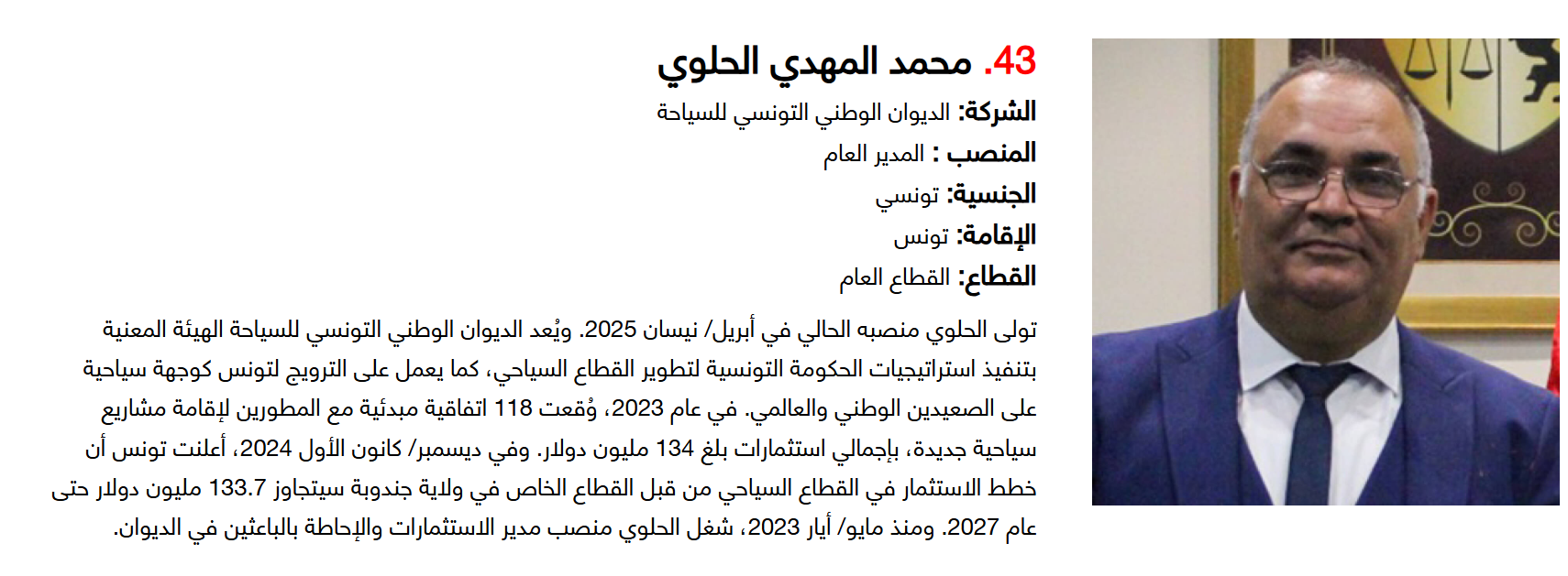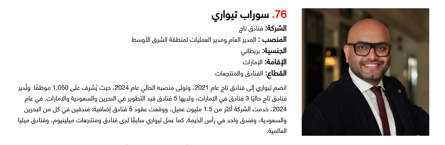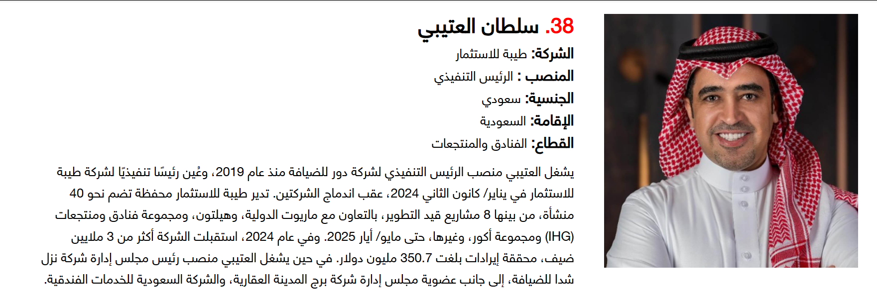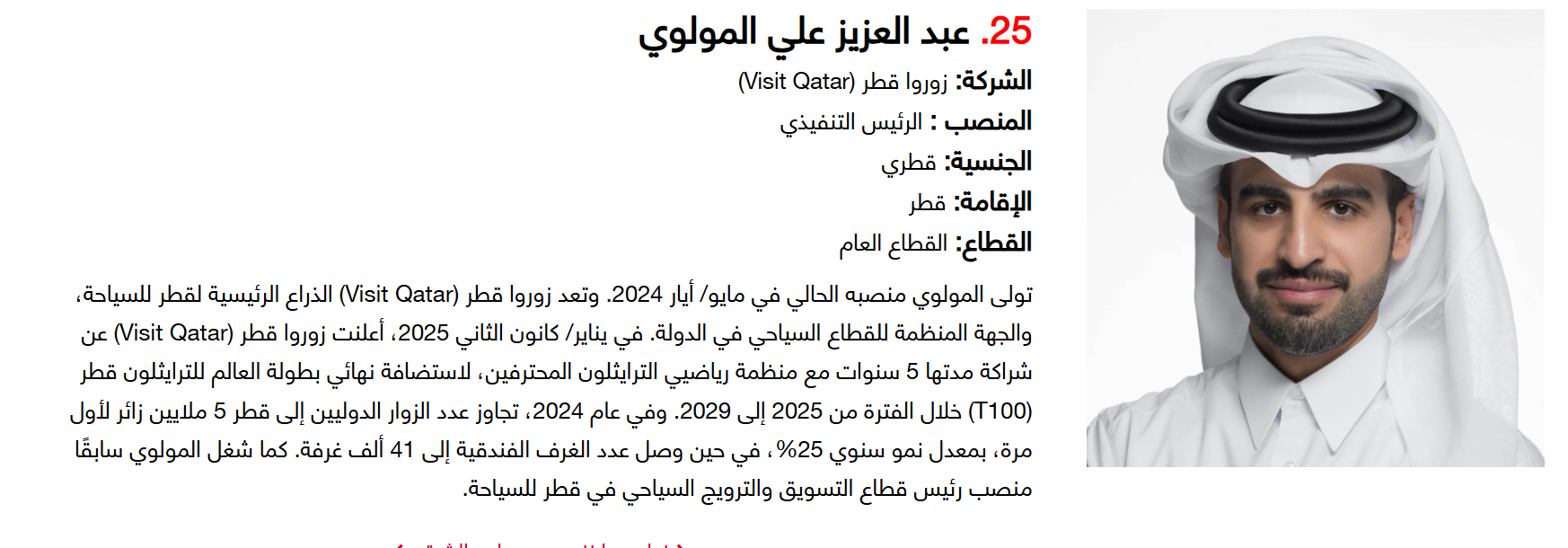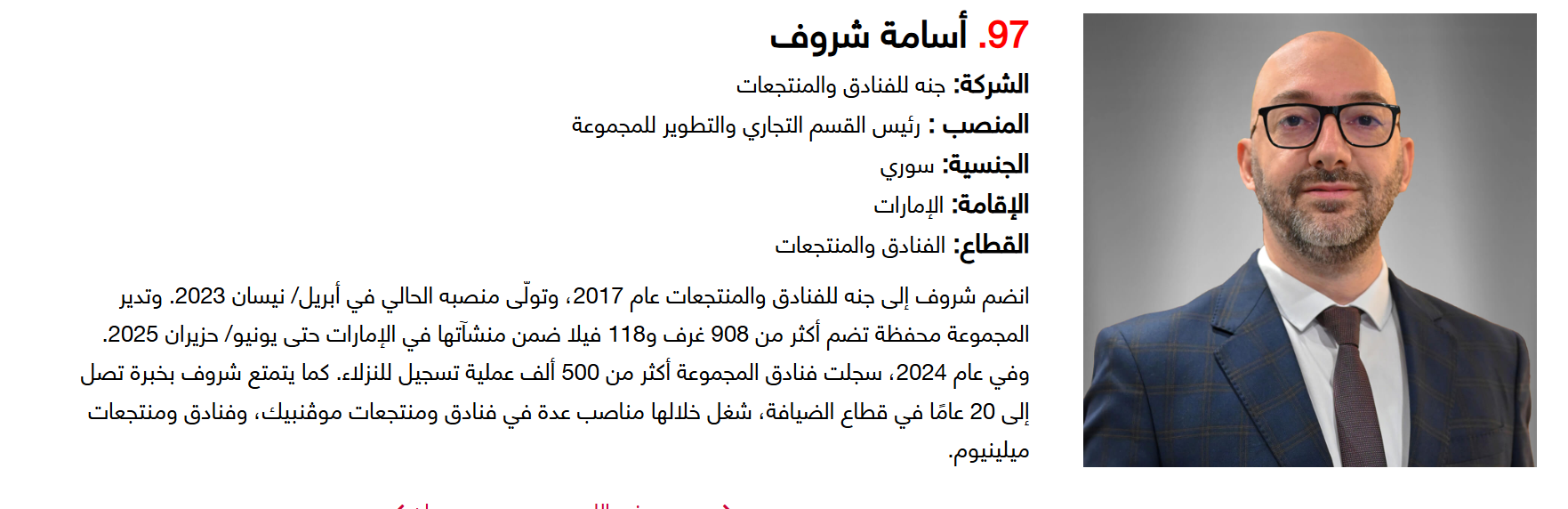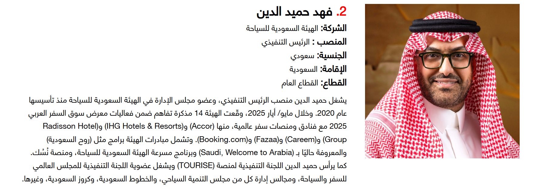 وتضم القائمة 100 شخصية قيادية تدير كبرى المشروعات في مجالات الضيافة والوجهات السياحية وسلاسل الفنادق والمطارات وشركات الطيران وخدمات السفر والمبادرات السياحية المبتكرة. وجاء التصنيف استنادا إلى حجم أعمال الشركات، قيم الأصول، وعدد الفنادق والغرف وأعداد الزوار، إضافة إلى الخبرات المهنية والإنجازات والتأثير في المشهد السياحي الإقليمي.