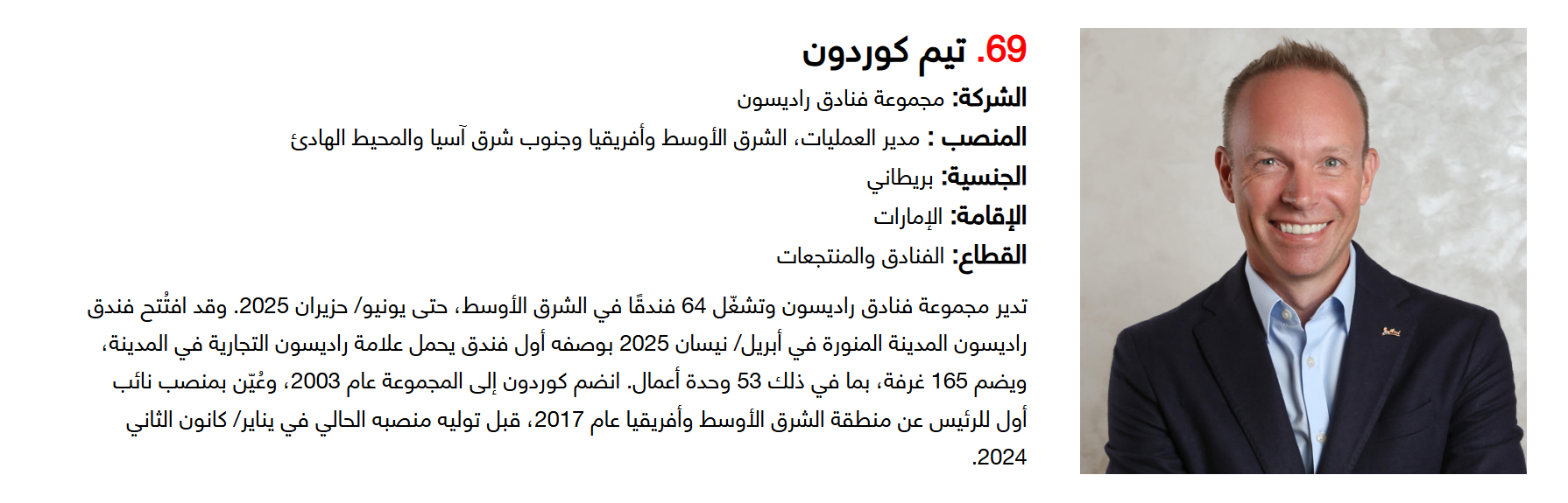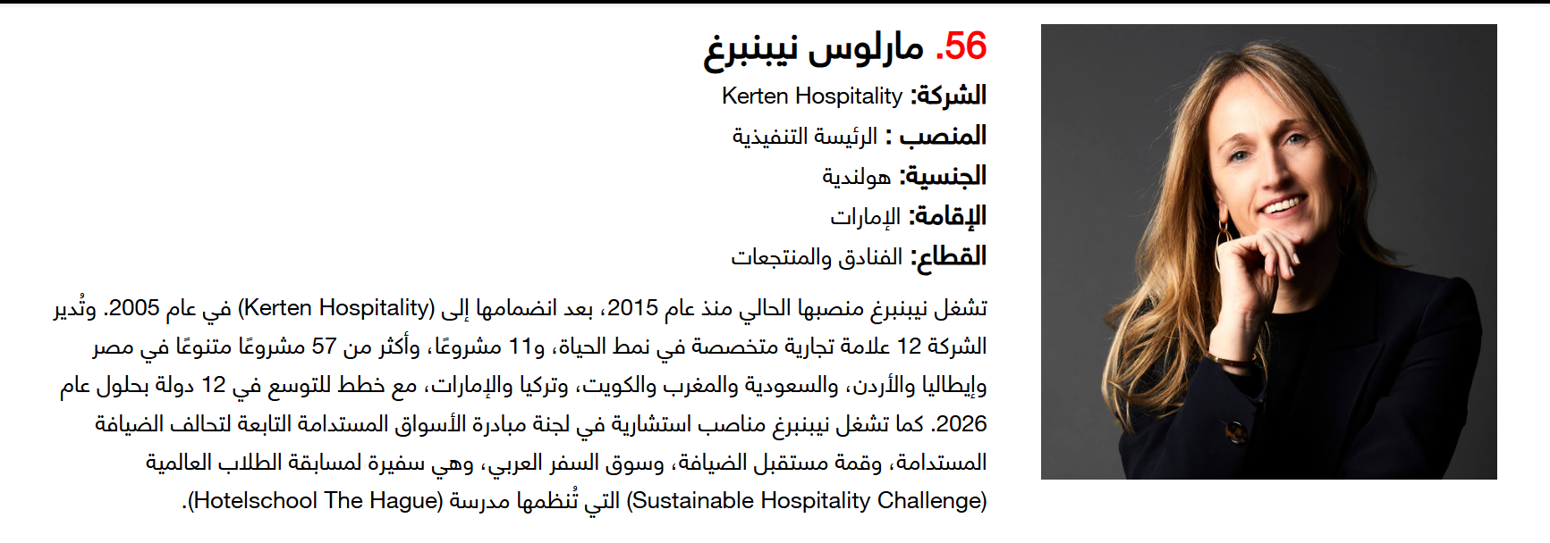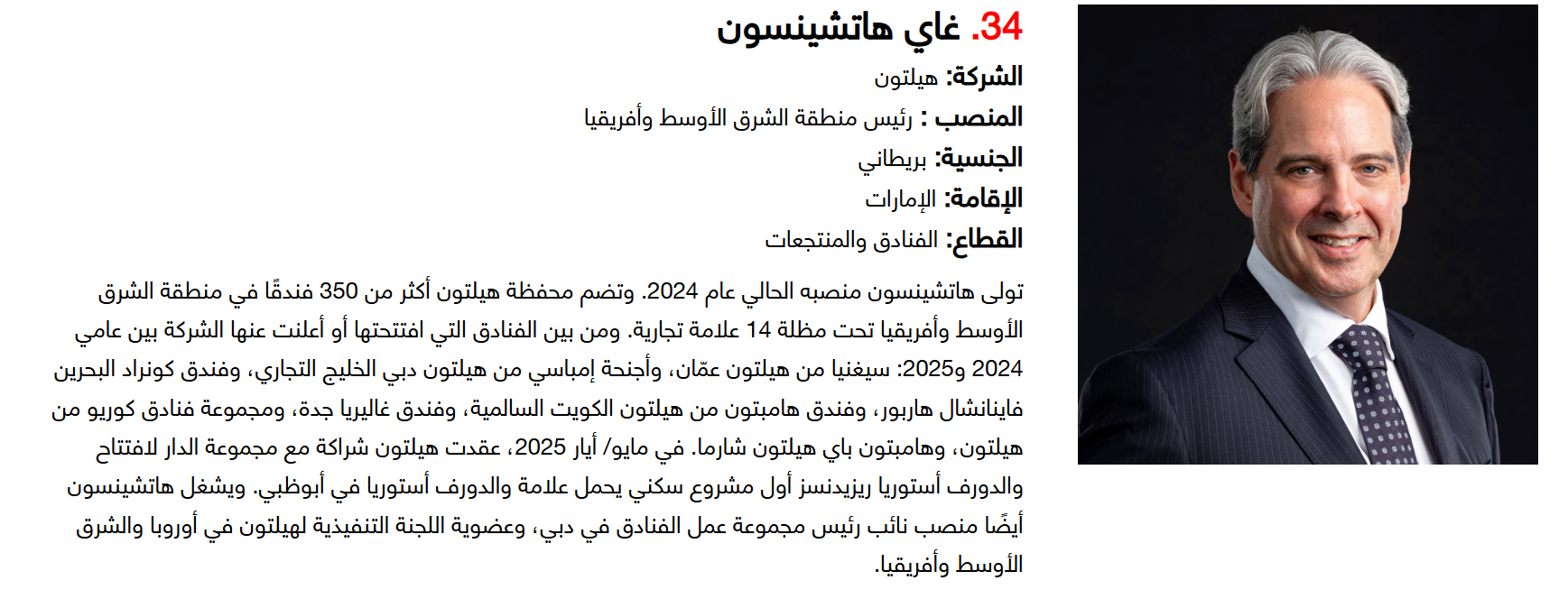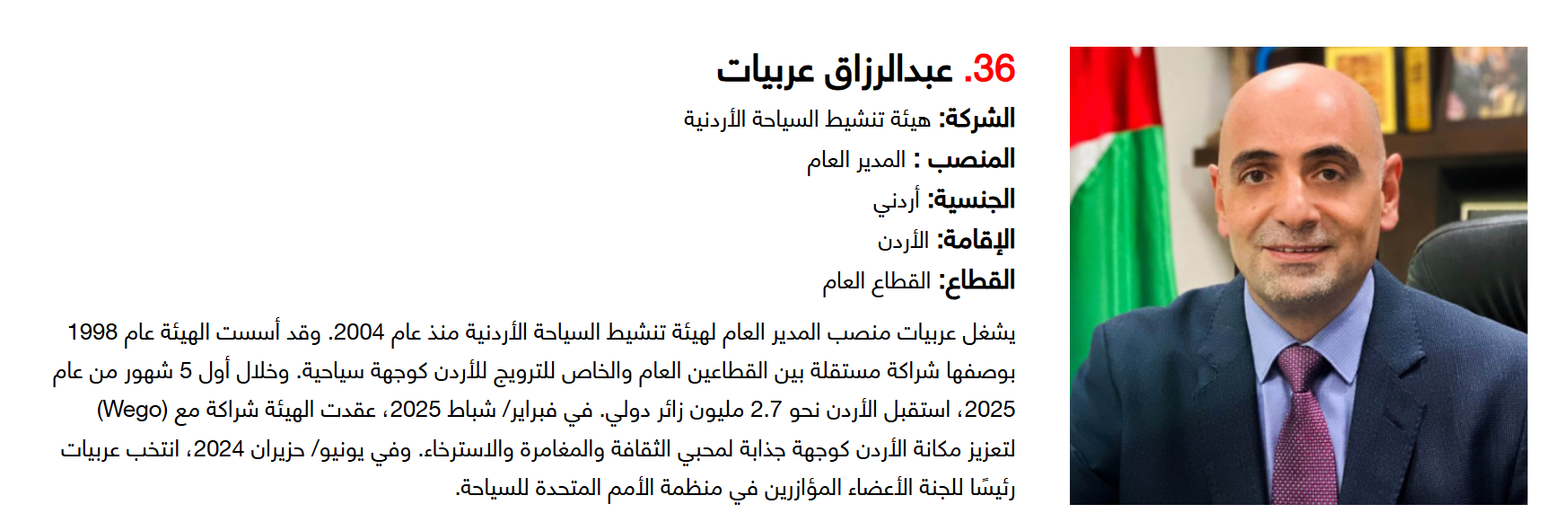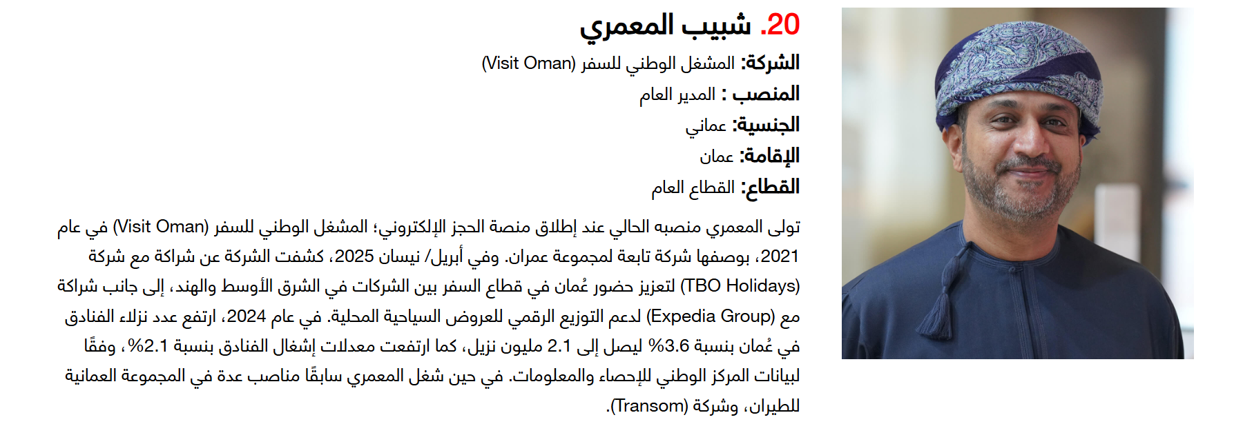 وتضم القائمة 100 شخصية قيادية تدير كبرى المشروعات في مجالات الضيافة والوجهات السياحية وسلاسل الفنادق والمطارات وشركات الطيران وخدمات السفر والمبادرات السياحية المبتكرة. وجاء التصنيف استنادا إلى حجم أعمال الشركات، قيم الأصول، وعدد الفنادق والغرف وأعداد الزوار، إضافة إلى الخبرات المهنية والإنجازات والتأثير في المشهد السياحي الإقليمي.