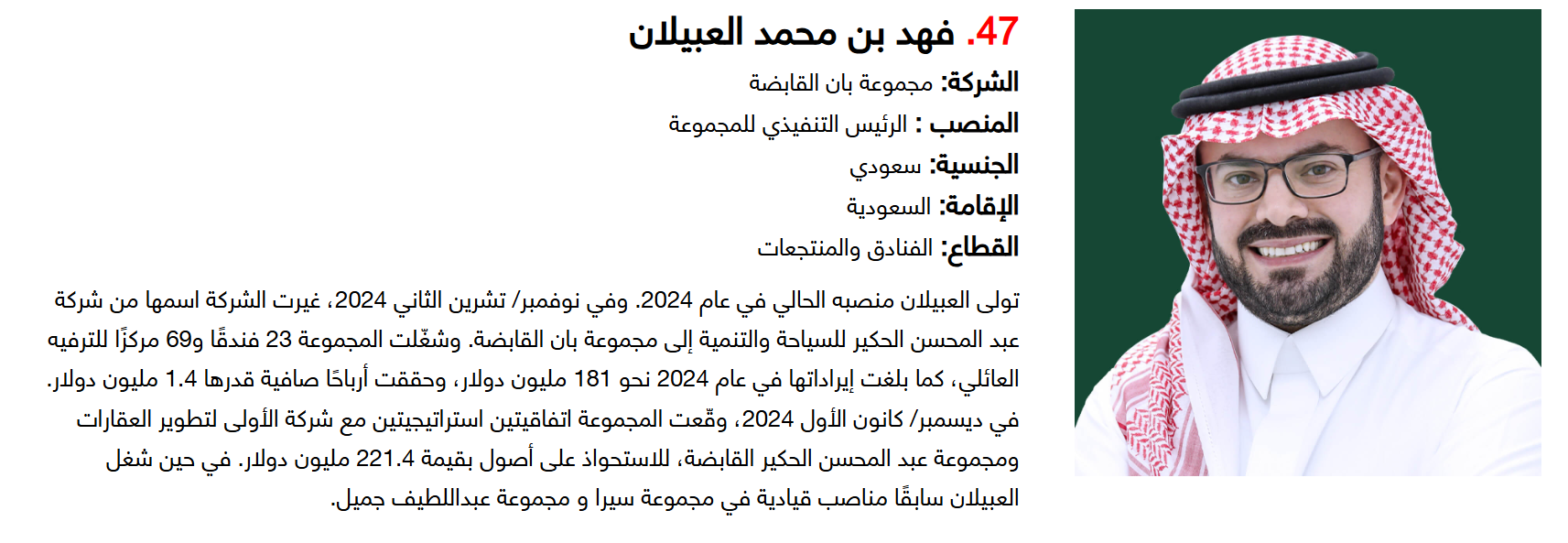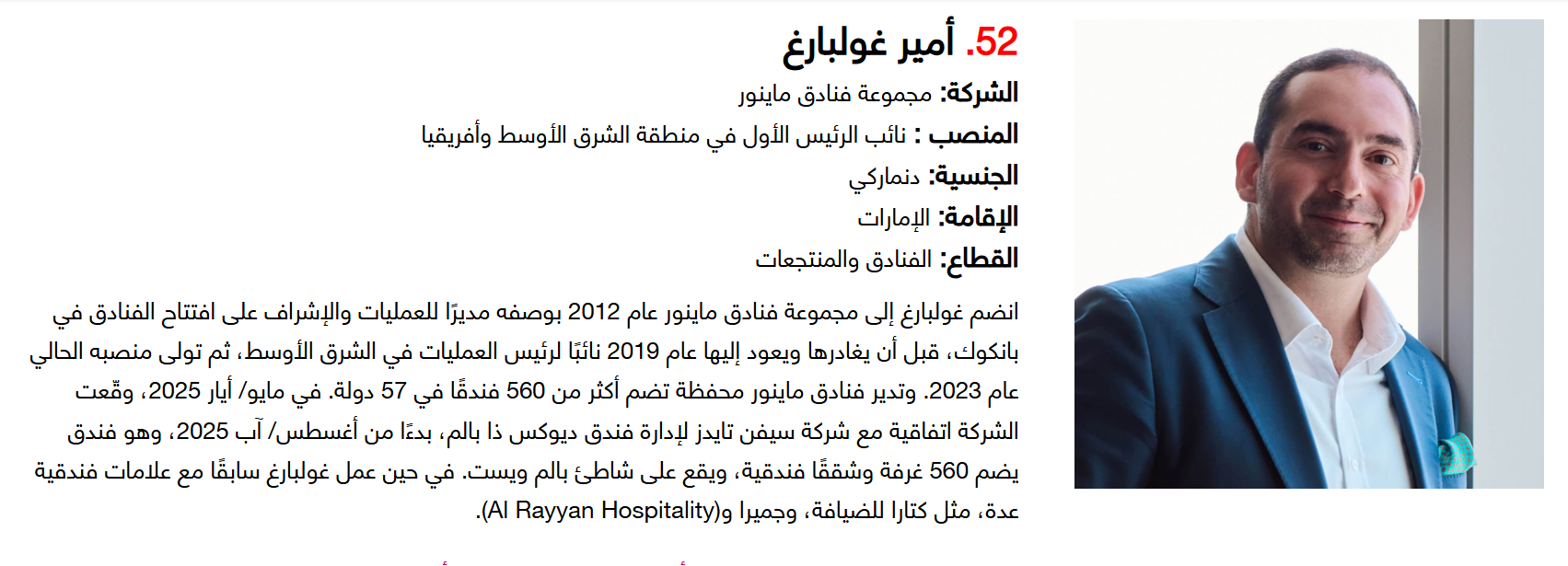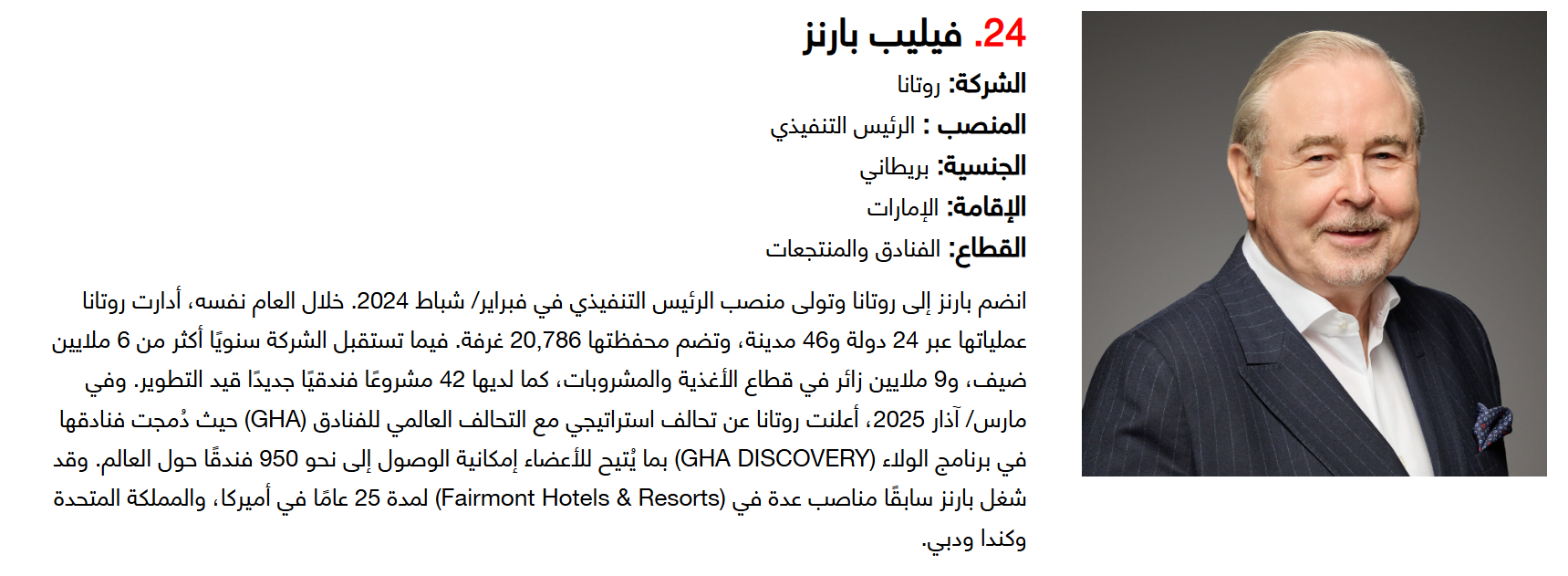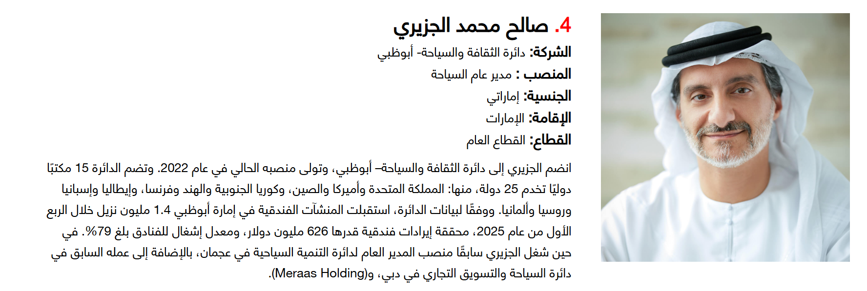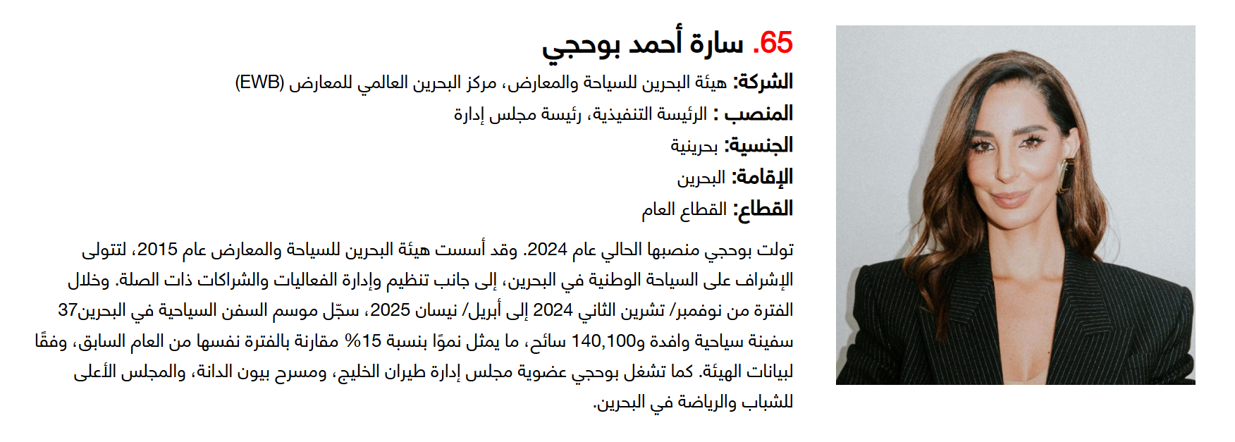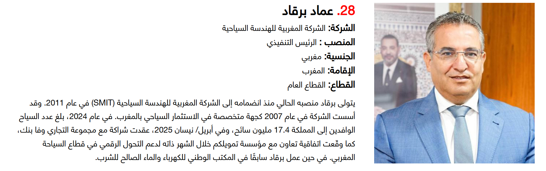 وتضم القائمة 100 شخصية قيادية تدير كبرى المشروعات في مجالات الضيافة والوجهات السياحية وسلاسل الفنادق والمطارات وشركات الطيران وخدمات السفر والمبادرات السياحية المبتكرة. وجاء التصنيف استنادا إلى حجم أعمال الشركات، قيم الأصول، وعدد الفنادق والغرف وأعداد الزوار، إضافة إلى الخبرات المهنية والإنجازات والتأثير في المشهد السياحي الإقليمي.