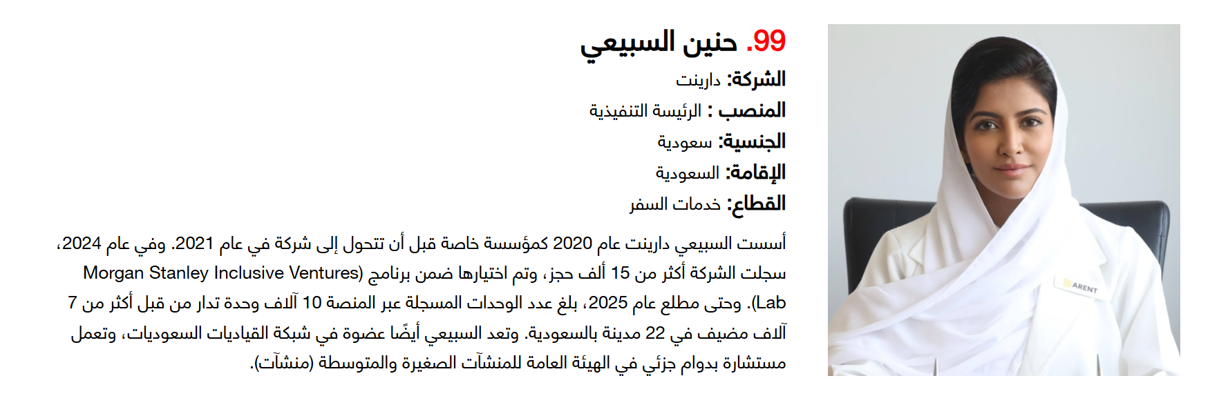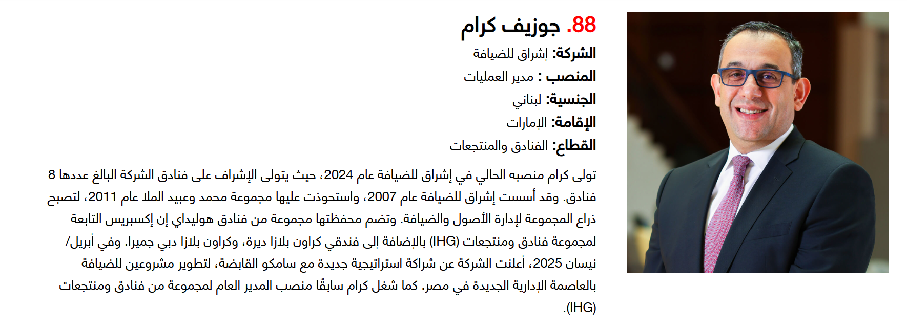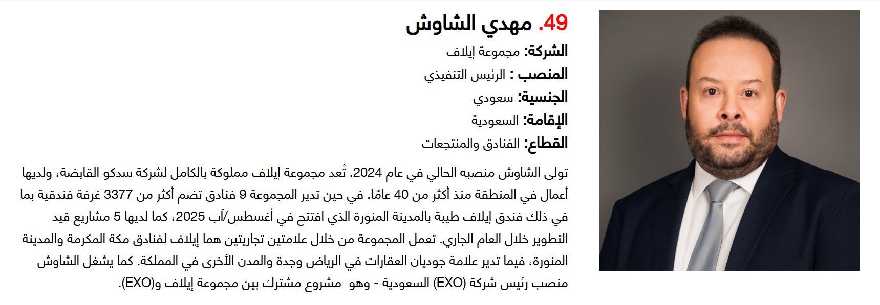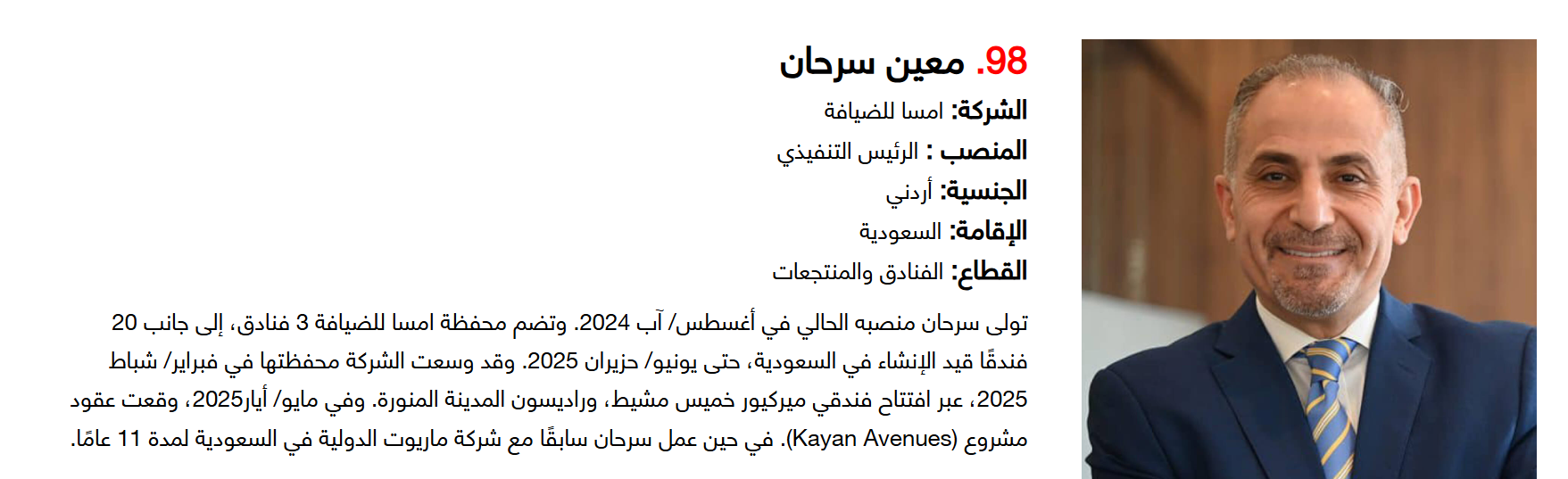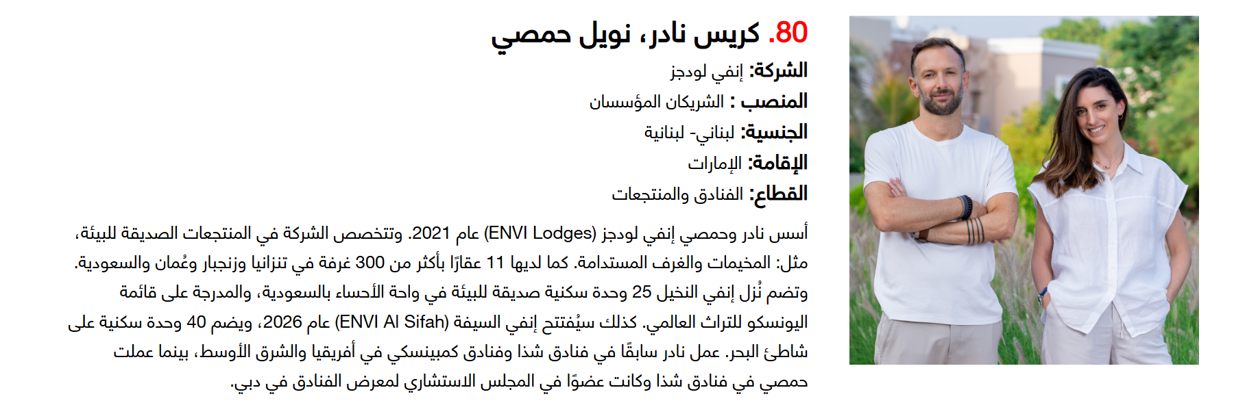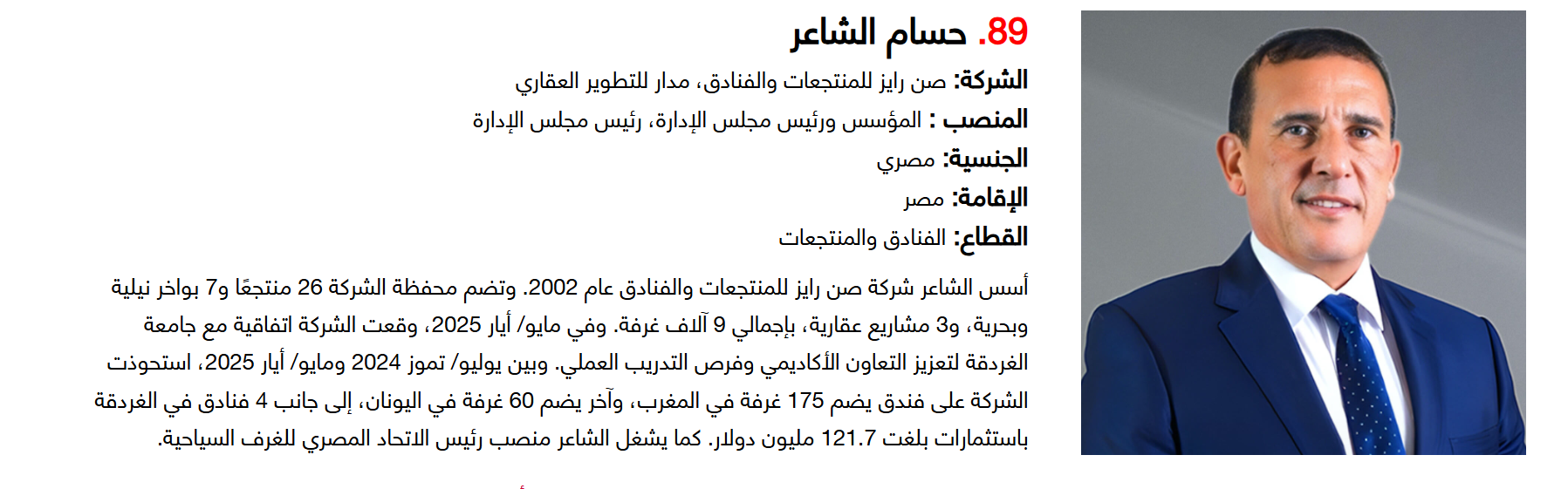 وتضم القائمة 100 شخصية قيادية تدير كبرى المشروعات في مجالات الضيافة والوجهات السياحية وسلاسل الفنادق والمطارات وشركات الطيران وخدمات السفر والمبادرات السياحية المبتكرة. وجاء التصنيف استنادا إلى حجم أعمال الشركات، قيم الأصول، وعدد الفنادق والغرف وأعداد الزوار، إضافة إلى الخبرات المهنية والإنجازات والتأثير في المشهد السياحي الإقليمي.