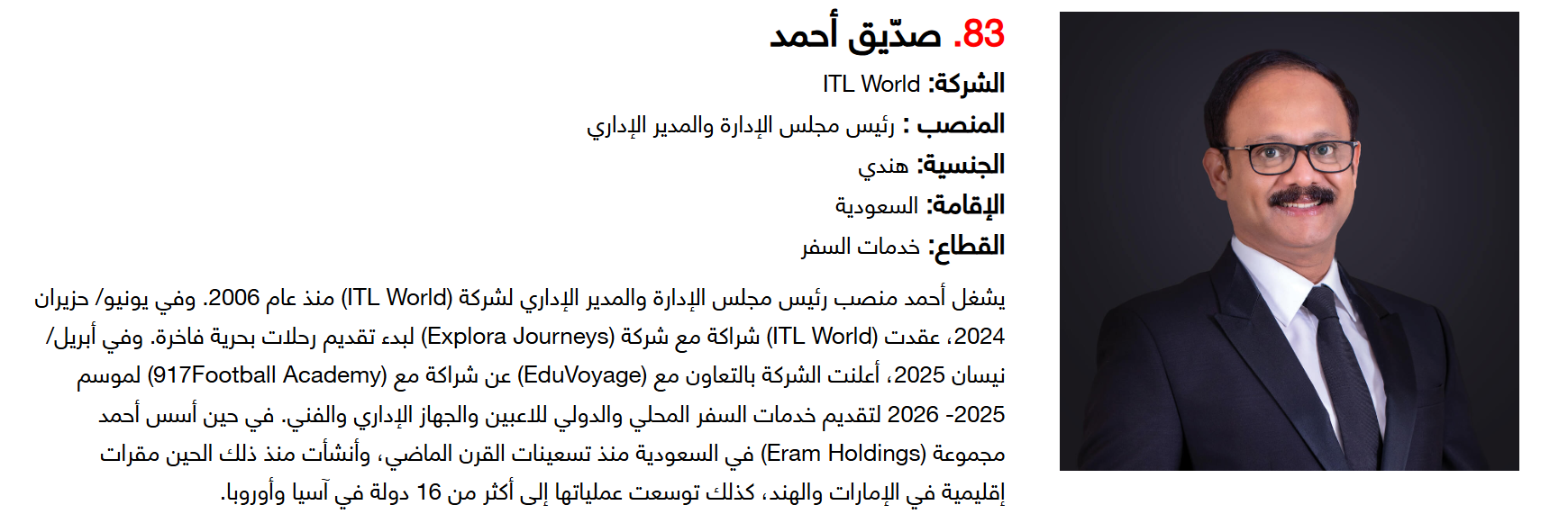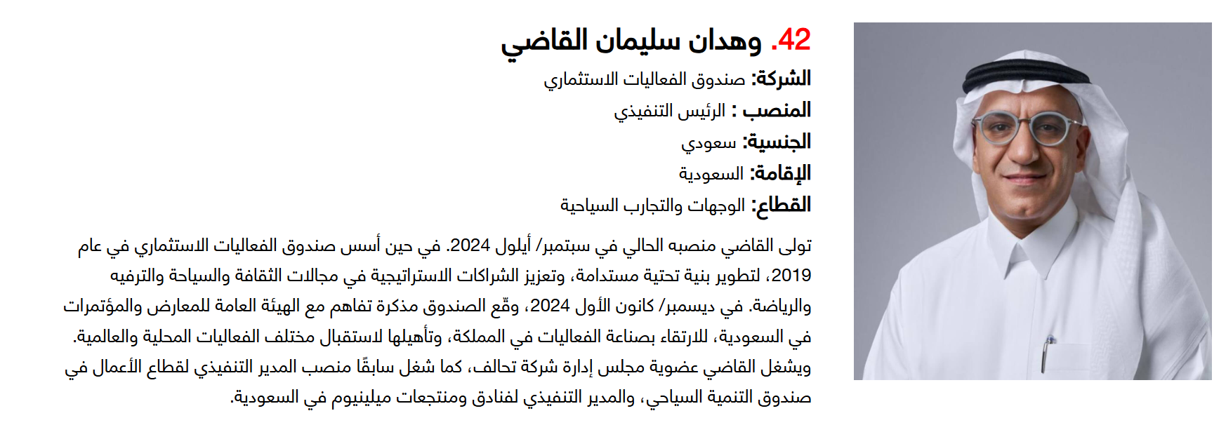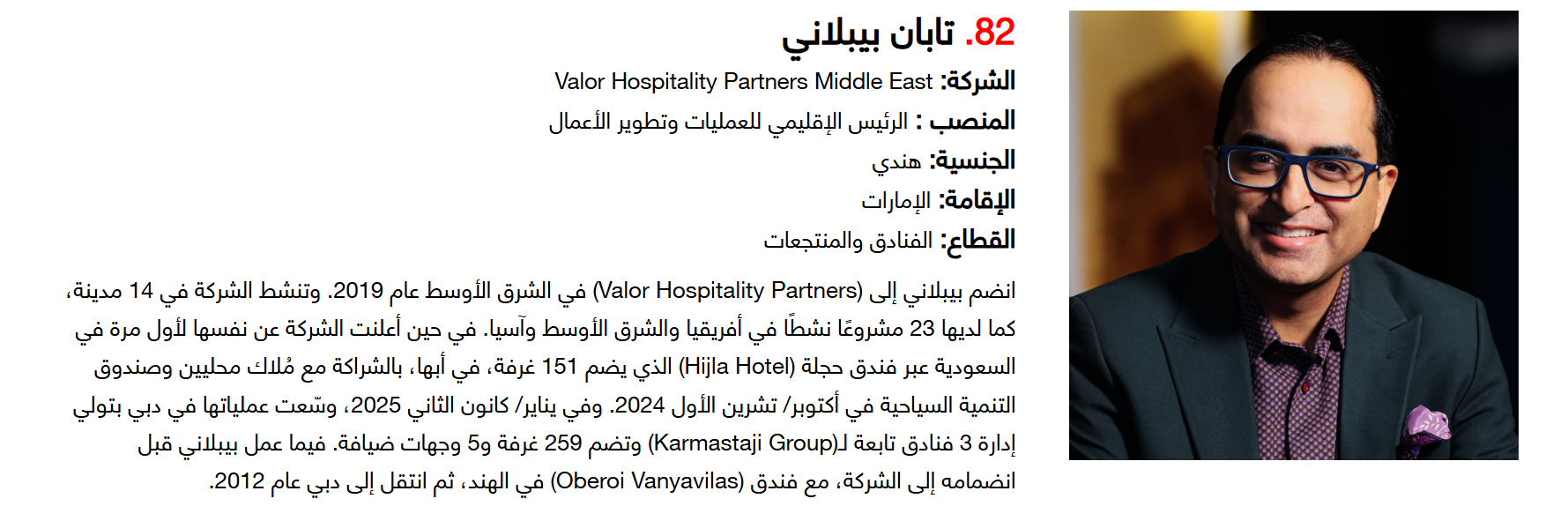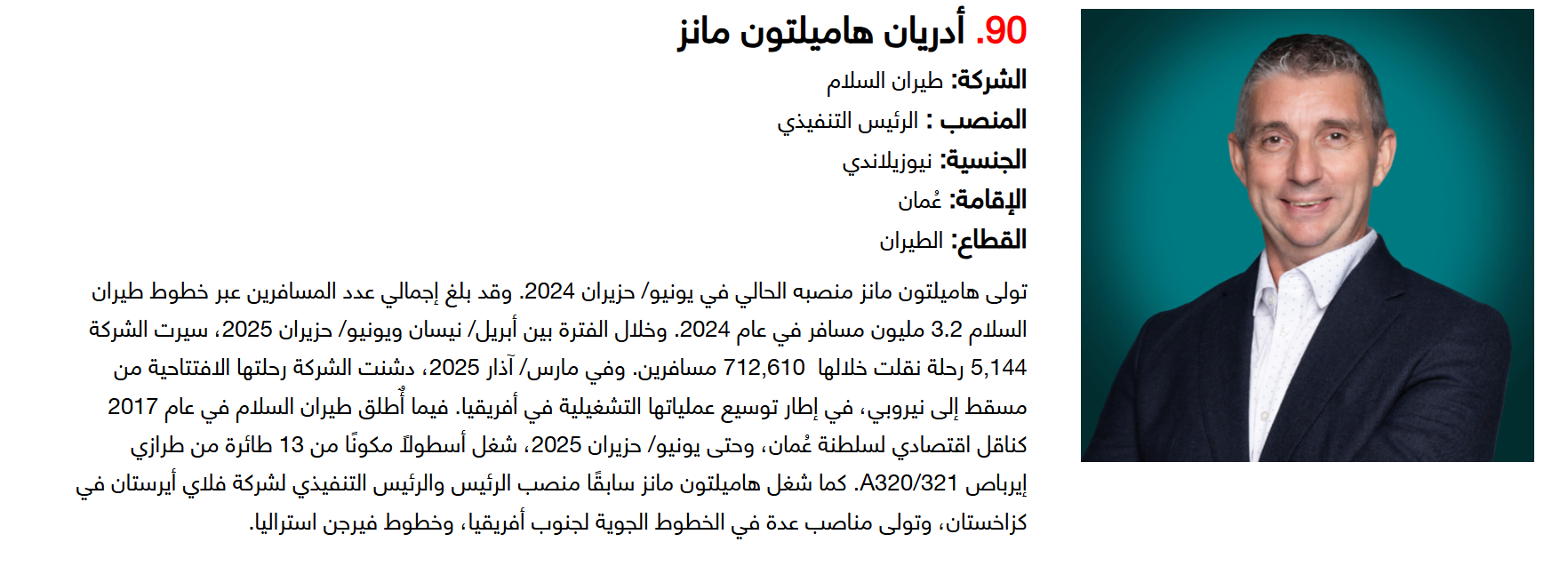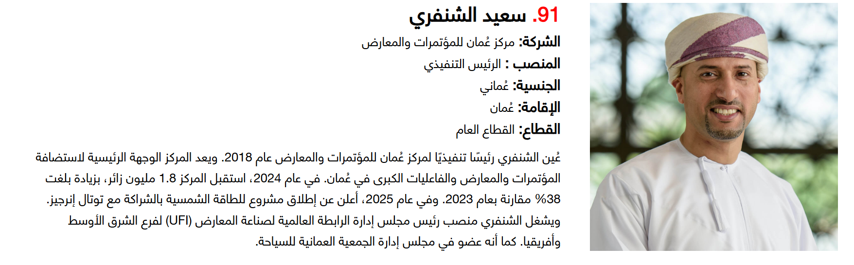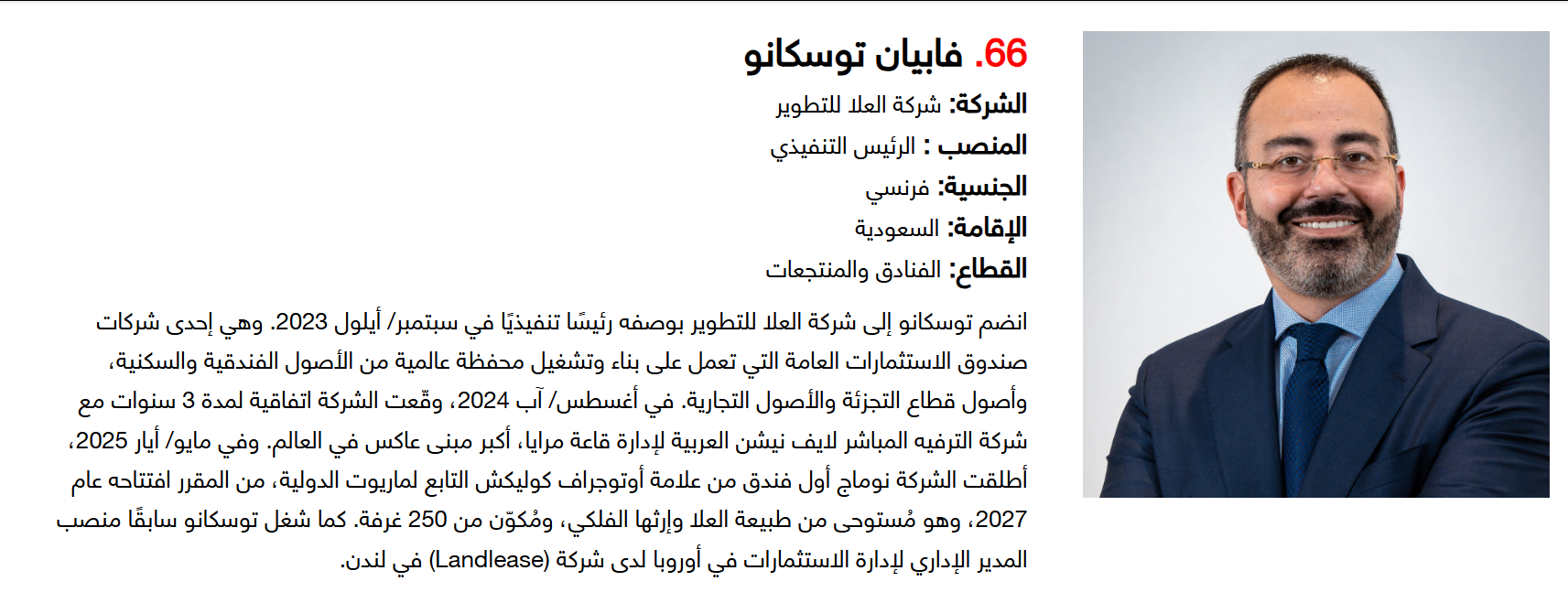 وتضم القائمة 100 شخصية قيادية تدير كبرى المشروعات في مجالات الضيافة والوجهات السياحية وسلاسل الفنادق والمطارات وشركات الطيران وخدمات السفر والمبادرات السياحية المبتكرة. وجاء التصنيف استنادا إلى حجم أعمال الشركات، قيم الأصول، وعدد الفنادق والغرف وأعداد الزوار، إضافة إلى الخبرات المهنية والإنجازات والتأثير في المشهد السياحي الإقليمي.