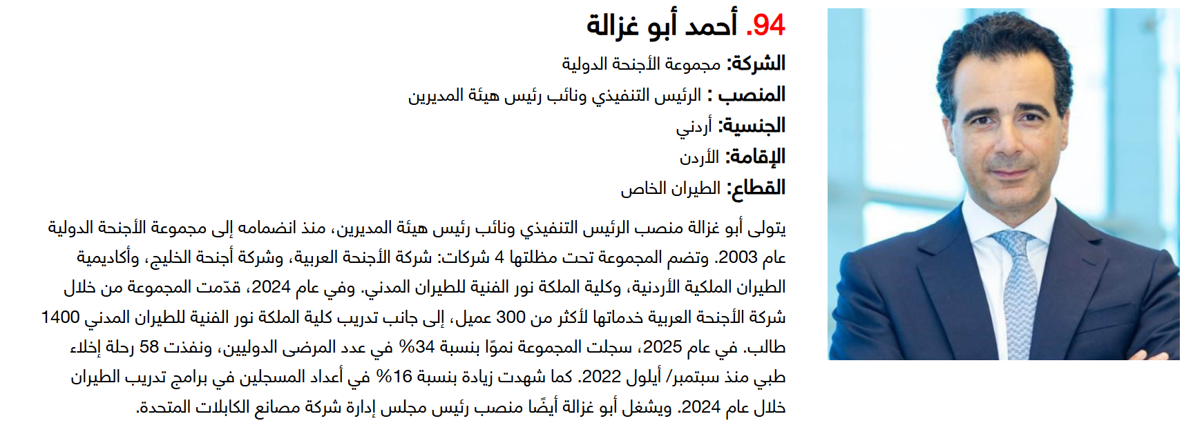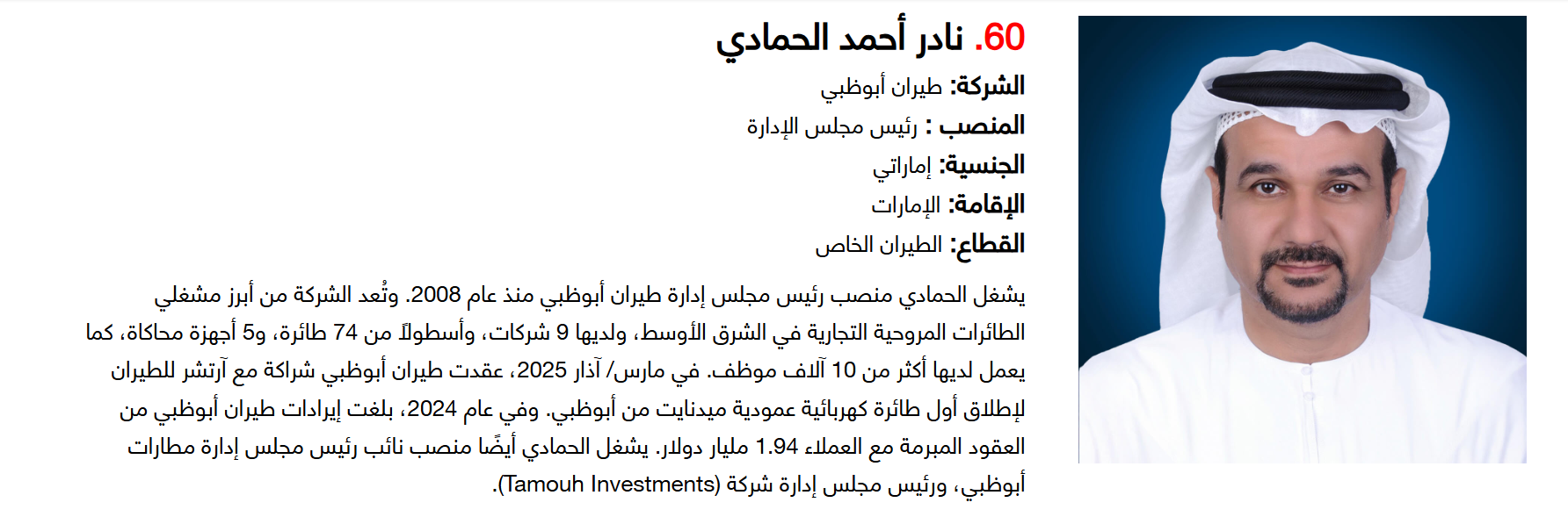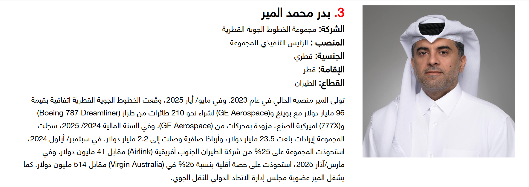 أما على صعيد الجنسيات، فقد تصدر الإماراتيون القائمة بـ15 قائدا، تلاهم السعوديون بـ14 قائدا، ثم البريطانيون بـ9 قادة، لتشكل هذه الجنسيات الـ3 النسبة الأكبر ضمن التصنيف.