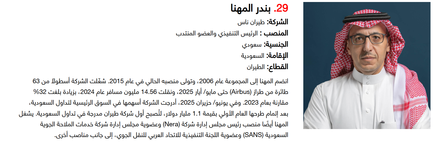 ففي يونيو 2025، قاد بندر المهنا، الرئيس التنفيذي والعضو المنتدب لطيران ناس، عملية الطرح العام الأولي للشركة في السوق الرئيسية لتداول السعودية بقيمة 1.1 مليار دولار، لتصبح أول شركة طيران مدرجة في السوق السعودية.